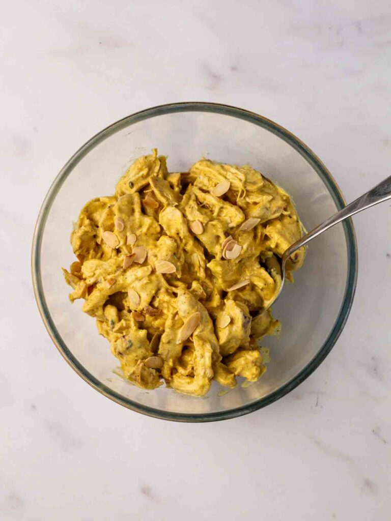 Sauce: The luscious sauce combines mayonnaise, extra Greek yoghurt, mango chutney, mild curry powder, chopped dried apricots, flaked toasted almonds, and a pinch of salt and pepper, creating the perfect balance of creamy, tangy, nutty, and lightly spiced flavors.